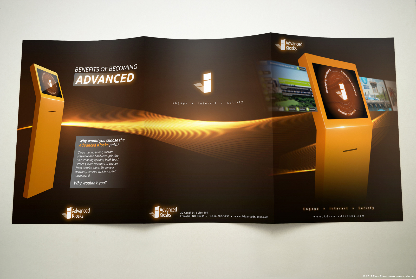 Product 3d rendering artwork used for kiosk software marketing double page flyer design.