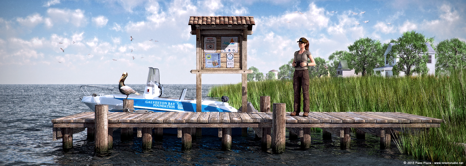 Panoramic lanscape illustration created for an interactive kiosk located at a natural park reserve to provide information to visitors and promote the care of the Galveston Bay Foundation natural environment and provide controlled fishing permits.